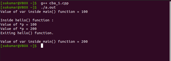 In this example, we are going to demonstrate the call by address mechanism. From the “main()” function, we are calling the “hello()” function and passing the address of “var”. In the function definition, we are receiving the address of “var” in a pointer variable, i.e., “p”. Inside the function hello, the value of “var” is being changed to 200 with the help of the pointer. Therefore, the value of “var” is getting changed to 200 inside the “main()” function after the “hello()” function call.