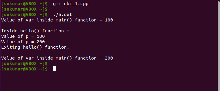In this example, we are going to demonstrate how call by reference works in C++. In the “hello()” function definition, the value is being received as a reference variable (&p). With the help of the reference variable (i.e., p), we are able to change the value of the actual parameter (var) inside the “main()” function.