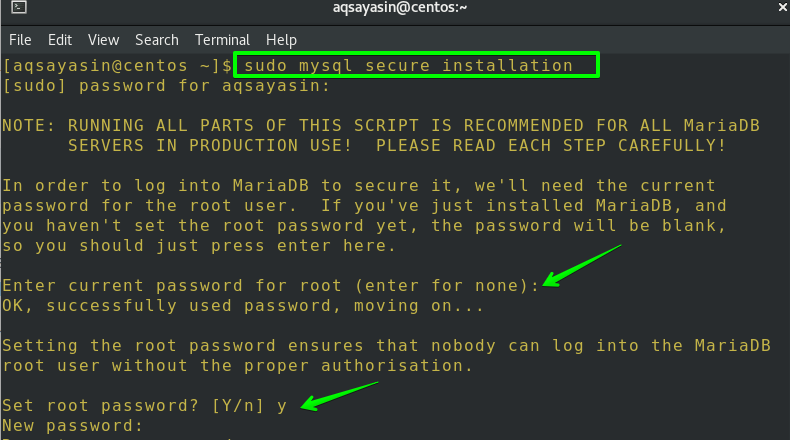 You will be asked to enter your current account password to proceed after that. You will then be asked to place a password for the root account of MariaDB that has not yet been set, so you have to press ENTER as suggested. Note that it is for the root account of the database, not really for the root account of your Centos server itself. To set a passcode for the root database user, tap ‘y’ and then ENTER, and after that, go through all the instructions.