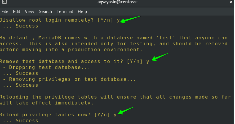 You have to accept all the safety recommendations by tapping ‘y’ and then ENTER after updating the password. It will delete anonymous users, disable remote root login, erase the test database, and load up the tables of privileges.