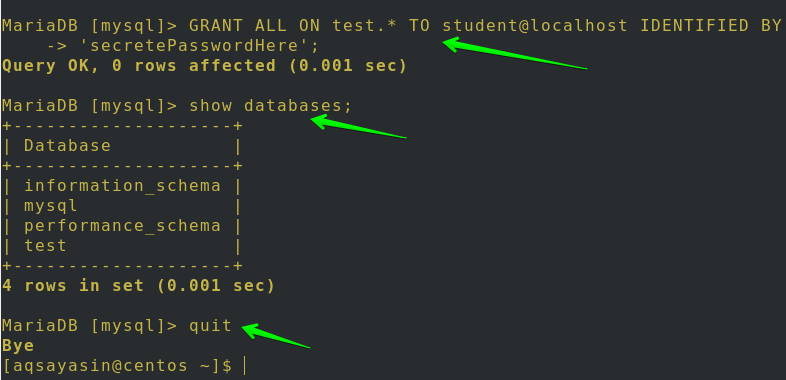 Build a new user for the test database named ‘student’. You can feel free to substitute secretePasswordHere with the real password you want to add. Try this command for adding a new user: