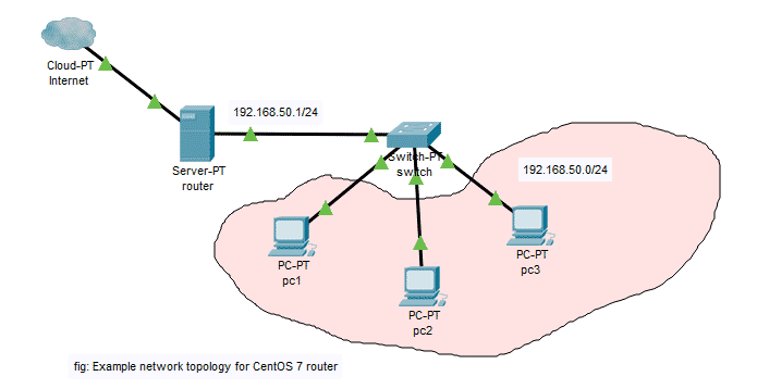 In this article, I am going to implement the network topology as given above in the figure. The server router has CentOS 7 installed and I am going to configure it as a router on the network. It has 2 NICs (Network Interface Cards). One NIC connects to the internet via the regional ISP and the other NIC is used for private networking and is connected to the switch. I am using the network 192.168.50.0/24 for the private network. So, the NIC that connects to the switch should have the IP address 192.168.50.1/24 (you can use others, but routers are usually configured to use the first usable IP address in the network).