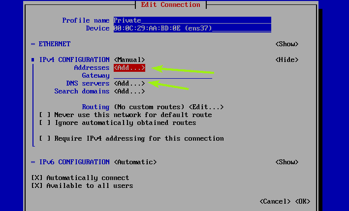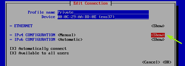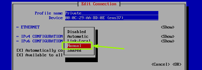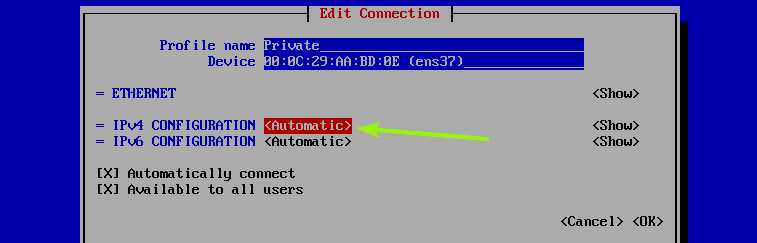 Now, change the profile name to Private. Giving a descriptive name is always a good idea. It will help your work much simpler. Now, select <Automatic> from the IPv4 CONFIGURATION section and press <Enter>.