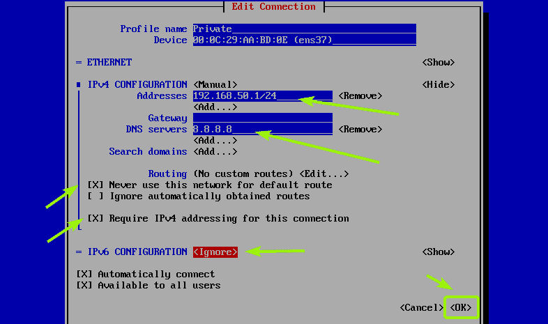 Once you’ve added the IP address and DNS server address, make sure Never use this network for default route, Require IPv4 addressing for this connection and Automatically connect check boxes are checked. I am also going to set IPv6 CONFIGURATION to Ignore as I don’t want to use IPv6. Then, select <OK> and press <Enter>.