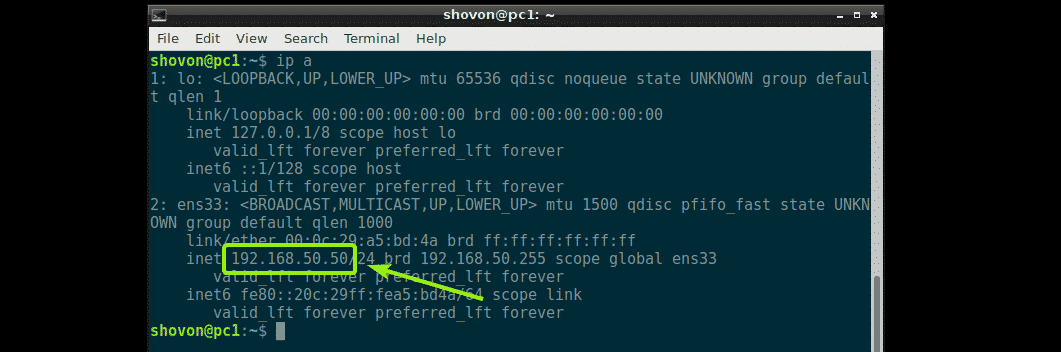 On the first computer pc1, I ran ip a command and as you can see, it got the IP address 192.168.50.50/24. So, DHCP is working.