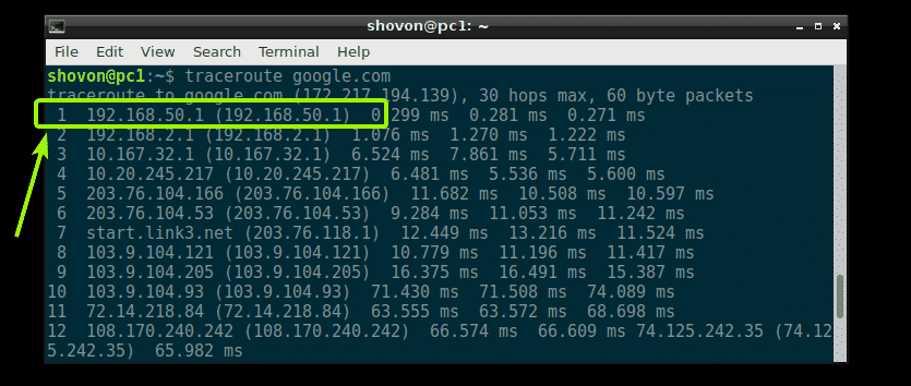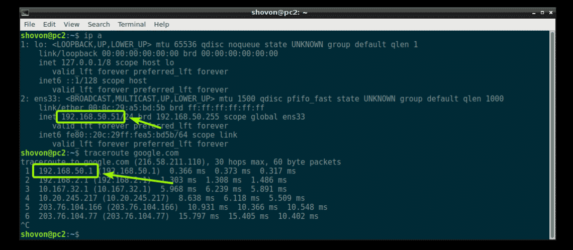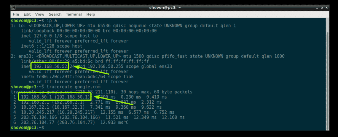I ran traceroute google.com and as you can see, the first router the packet goes through is our CentOS 7 router with the IP address 192.168.50.1/24. This is the one we just configured. So, IP routing works in pc1.
