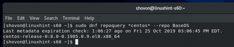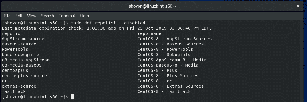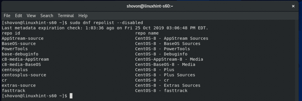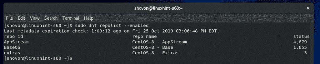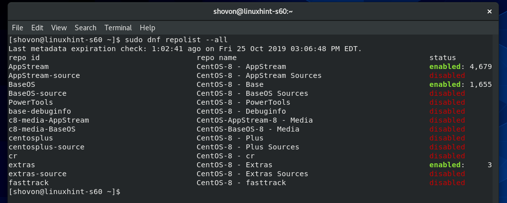 As you can see, all the enabled and disabled package repositories are displayed. On the repo id column, you have the Repository Id which you can use with the DNF –repo option. In the status column, you can see which repository is enabled and how many packages that particular repository has.