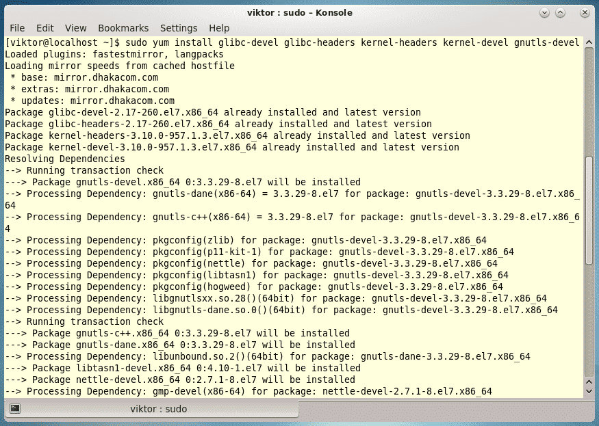sudo yum install glibc-devel glibc-headers kernel-headers kernel-devel gnutls-devel