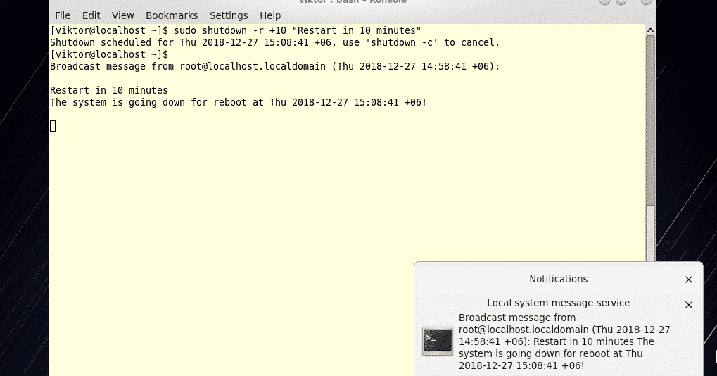 - +10 : Gives the system users 10 min time for performing all the pending actions as the system is going to restart itself after 10 minutes starting the count from running the command.