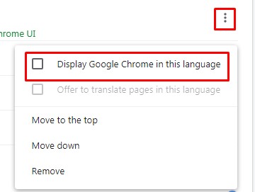 To make this English language option your default language, click on the three vertical dots on the right side of the menu and then select the option: Display Google Chrome in this language.
