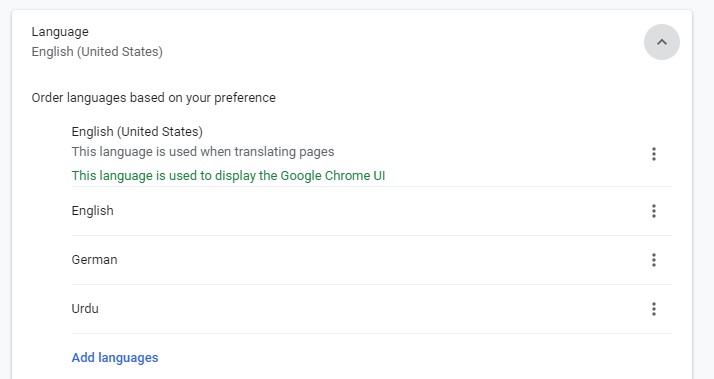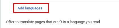 After opening the Language settings and the drop-down menu of your language list, if, however, English is not present in your list of languages, then you can add it over there. To do this, click on the Add languages text button highlighted in blue found at the bottom of your menu.