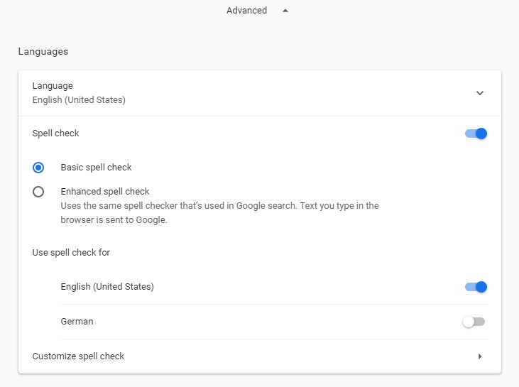 Upon opening the Advanced section, you will be greeted with the Language settings, several different options are present such as choosing the appropriate spell check or specifying which language to have the spell-check.