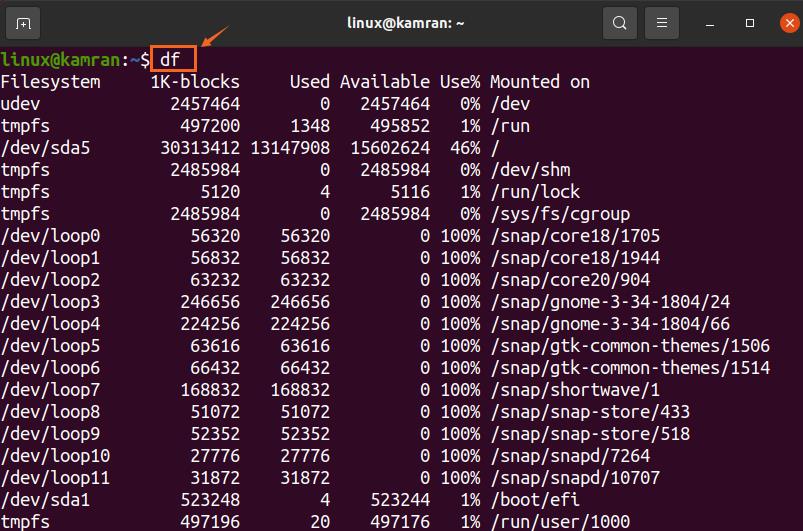 The df (Disk Filesystem) command comes pre-installed on Ubuntu 20.04, Ubuntu 20.10, and many other different Linux based operating system. The df command shows the information of various file systems. Moreover, we can use multiple options with it.