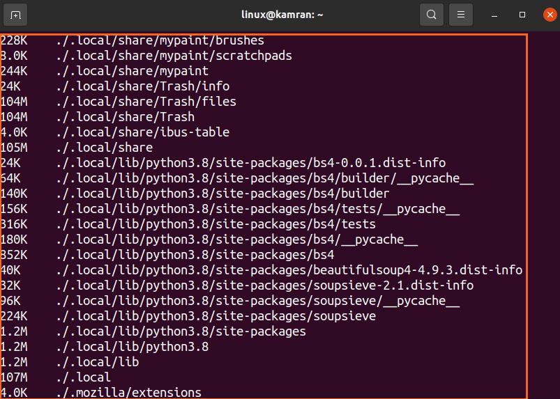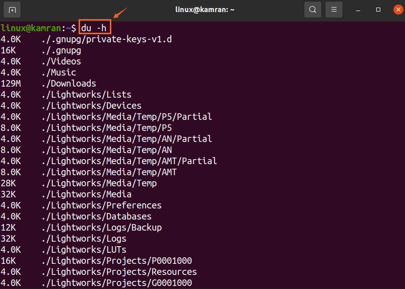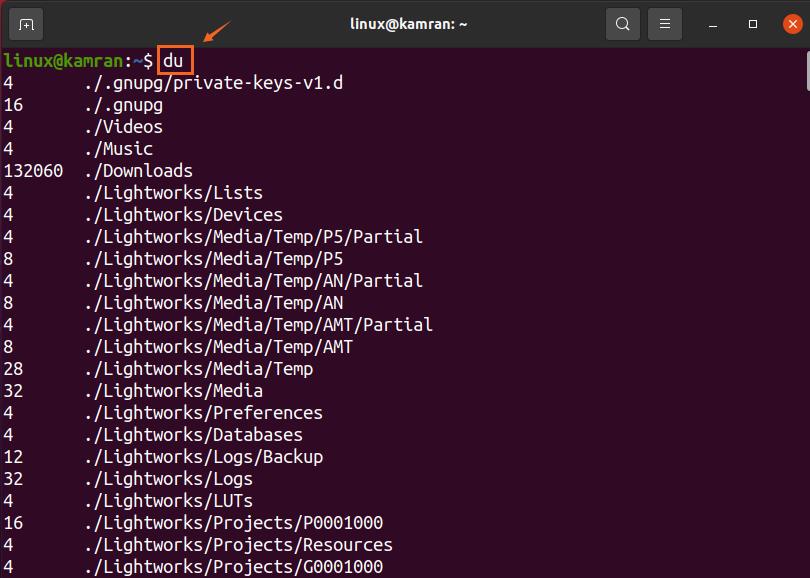 The du command stands for Disk Usage. It shows the disk information of every directory and subdirectory. Let’s execute the following du command: