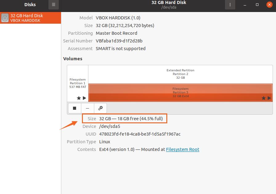 The ‘Disks’ utility shows the total size of the disk and the free disk space.