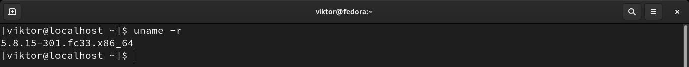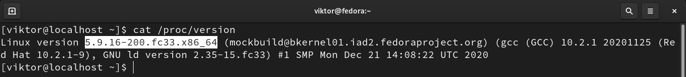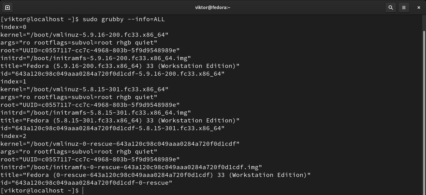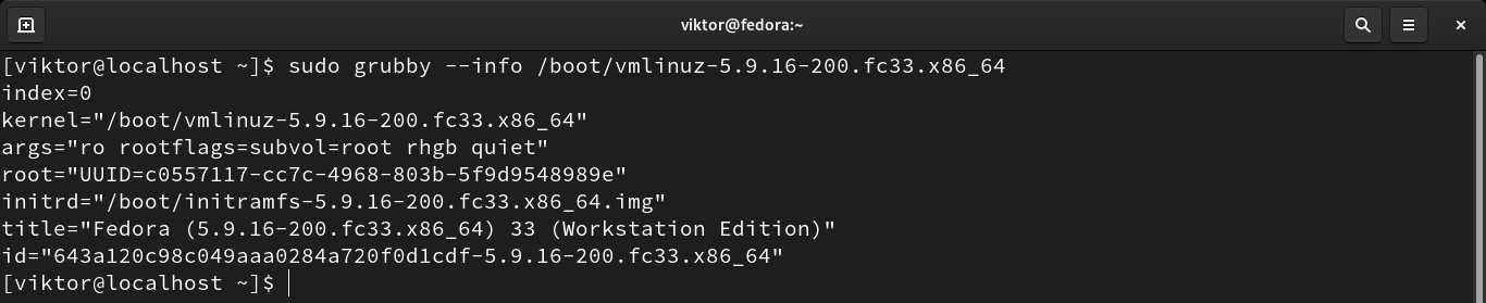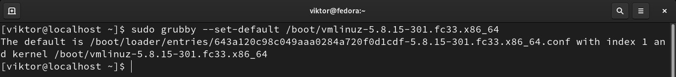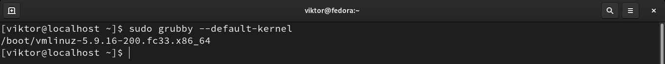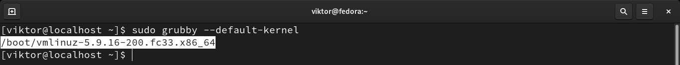To set a different kernel as the default kernel, take a note of the kernel location from the previous step and apply this location in the following command. In this case, I have set /boot/vmlinuz-5.8.15-301.fc33.x86_64 as the default kernel, instead of /boot/vmlinuz-5.9.16-200.fc33.x86_64.
