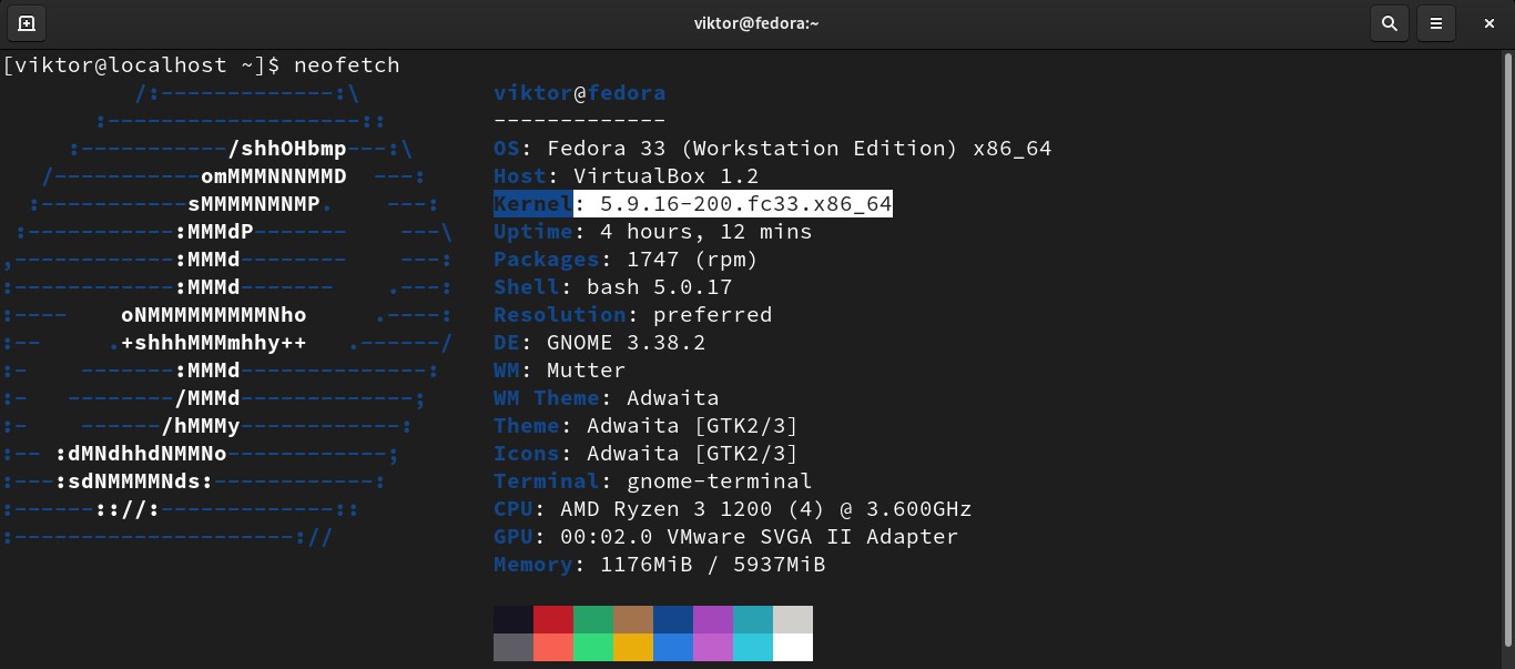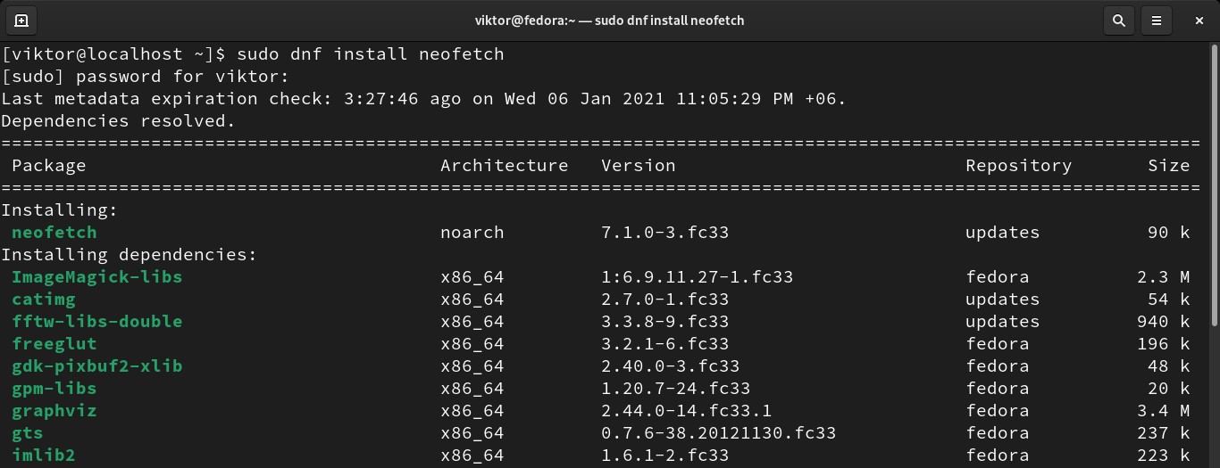 Neofetch is not a tool that comes pre-installed on Fedora. Thankfully, neofetch is directly available from the Fedora software repo. Install neofetch using the dnf command.