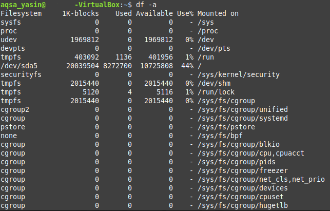 The df command can also be used in conjunction with the -a flag, which is used to display the disk space of all the file systems (i.e., your actual file system and also the dummy ones). Perform the steps shown below to use the df command with the -a flag: