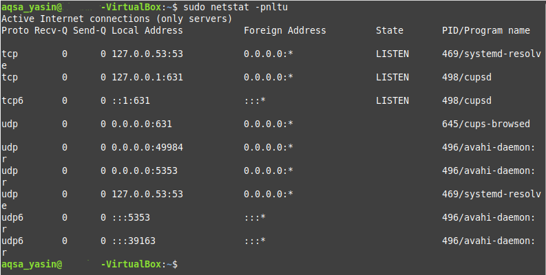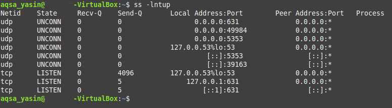 In the output of this command, the ports (both TCP and UDP) that are in use have the “LISTEN” state, whereas all the other ports show the “UNCONN” state.