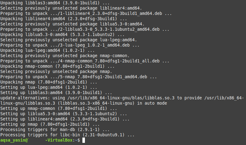 Once you have successfully installed the nmap utility on your Linux Mint 20 system, your terminal will return you the control back so that you can execute the next command, as shown in the image below: