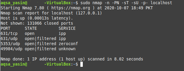 Once this command has been installed, it can be used for querying any ports that are in use in Linux. To check your system for open ports, execute the following command in your terminal:
