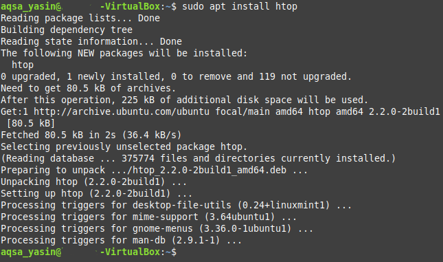 “htop” is another very useful Linux utility that is used to retrieve information about the running processes. “htop” is in fact, an advanced version of the “top” utility which has a better user interface and comparatively better performance. Since the “htop” utility is not installed on a Linux based system by default, therefore, to use it, you will have to install it first with the following command: