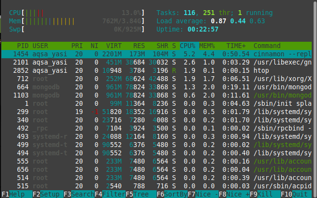 You can see from the output of the “htop” command shown in the image below that it is visually more appealing. The statistics that it reveals about the running processes are more or less the same as that of the “top” utility; however, they are displayed with more catchy colors. Hence, the output looks more fascinating. Also, the speed at which it retrieves these statistics and updates them is better than the “top” utility.