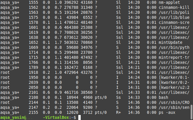 All the running processes of our Linux Mint 20 system along with their additional information are shown in the form of a table in the image below:
