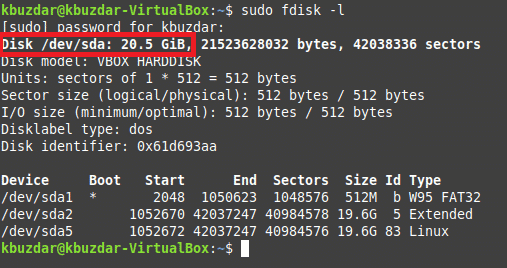 - The output of this command will show you all the partitions of your hard disk. We want to check the portion highlighted in the image shown below for errors using Linux Mint 20. Here, /dev/sda is the portion of the disk that we want to examine. In your case, this portion might have a different name.
