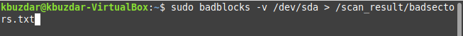 Here, the badblocks command also requires root privileges to execute and it will scan the specified portion of the hard disk (/dev/sda in this case) for any bad sectors, and if it finds any, it will list them down in the file named badsectors.txt which will be placed in the scan_result directory. Here, you should replace /dev/sda with the exact name of the hard disk portion that you want to scan for bad sectors. This command is also shown in the following image: