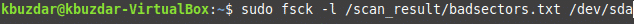 - Once this command is executed successfully, all the bad sectors will be stored in the badsectors.txt file. Now, our goal is to convey this message to our Linux Mint 20 that it should not be using the bad sectors mentioned in the badsectors.txt file in any way. For doing that, you will need to type the following command in your terminal and then press the Enter key: