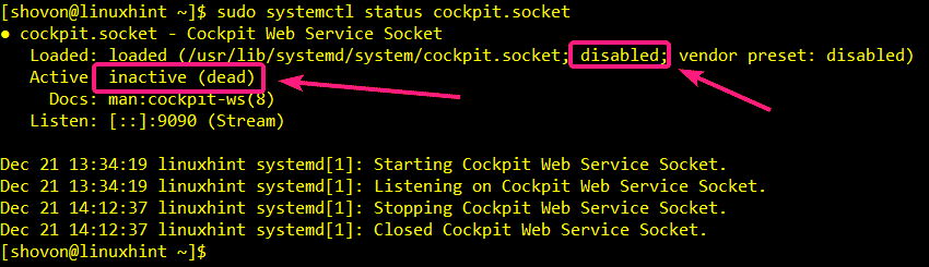 As you can see, the Cockpit web service socket is inactive (not running) and disabled (won’t automatically start on system boot).