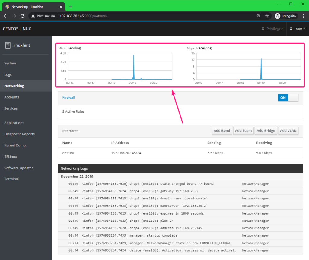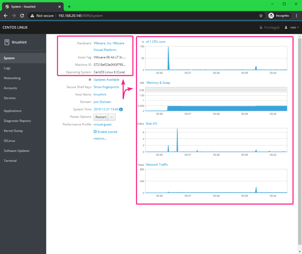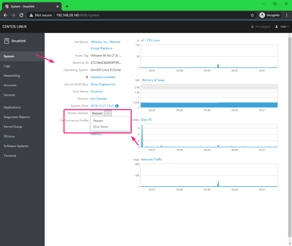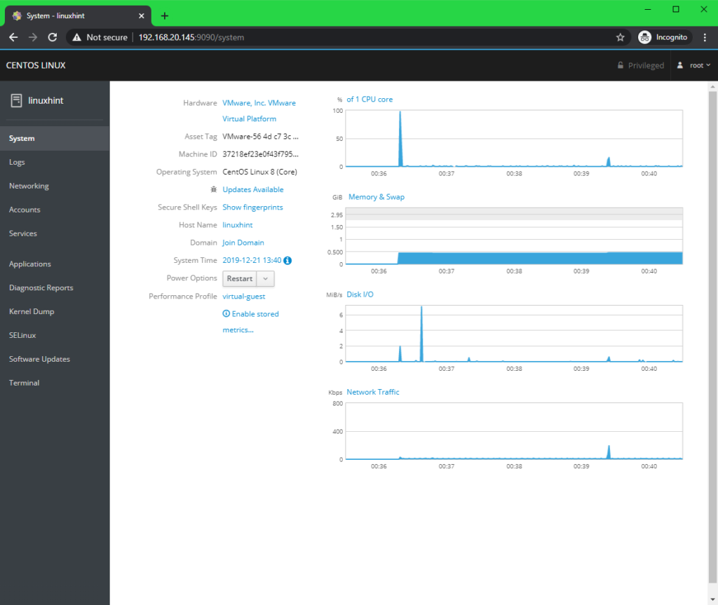 Managing and Monitoring CentOS 8 Server using Cockpit Web Console: