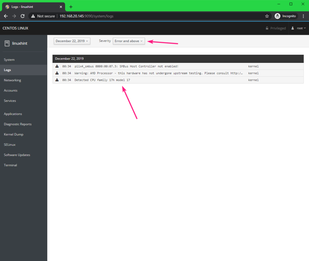 You can check all the system logs from the Logs tab. You can filter the log messages by Severity as well.