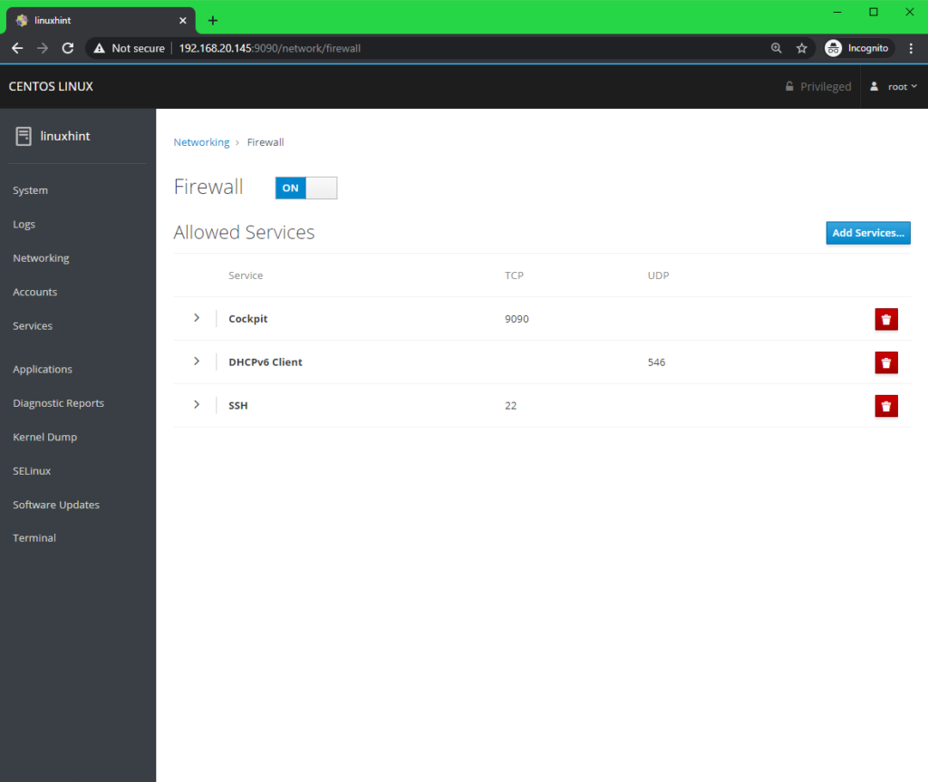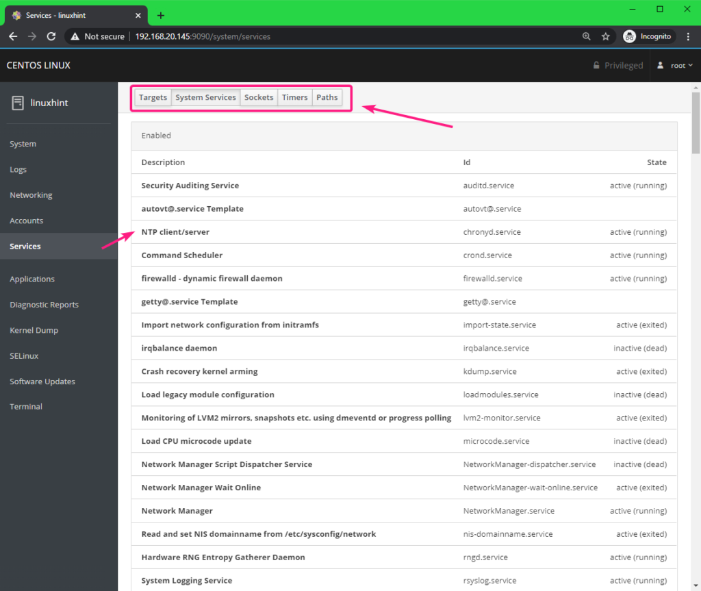 You can manage your CentOS 8 services from the Services tab. You can also navigate to different type of services from the buttons on the top.