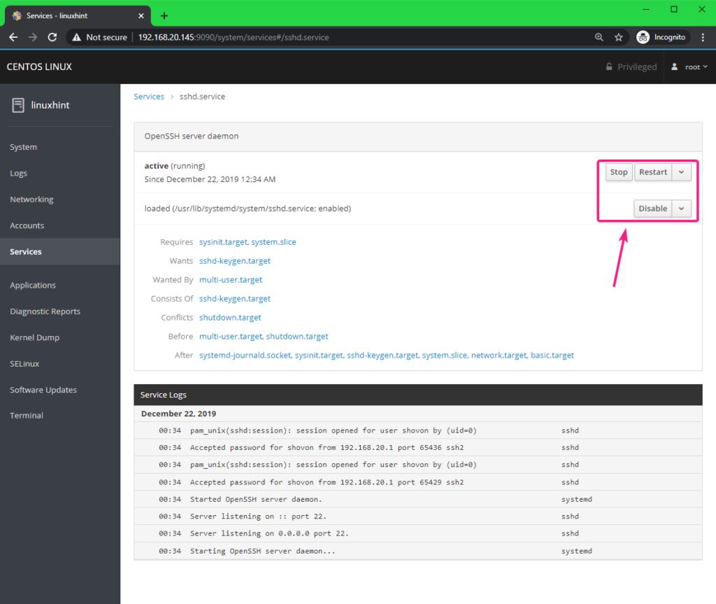 You can click on any service to learn more about it. You can stop, restart, start, enable/disable a service from here as well.