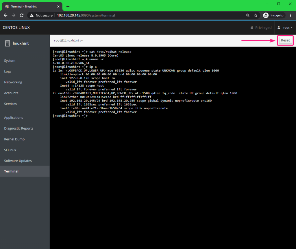From the Terminal tab, you can bring the CentOS 8 command line.