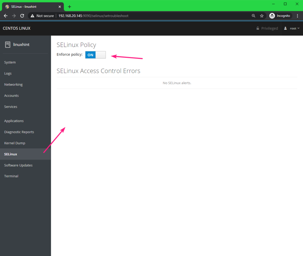 You can set SELinux to enforcing mode or permissive mode using the Enforce policy toggle button from the SELinux tab. From here, you can also see all the SELinux alerts.