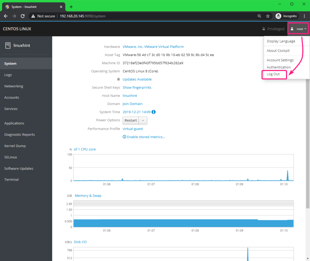 Once you’re done, you can logout of Cockpit web console. To do that, click on the dropdown menu at the top right corner and click on Log Out.