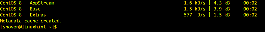 Now, update the CentOS 8 package repository cache with the following command:
