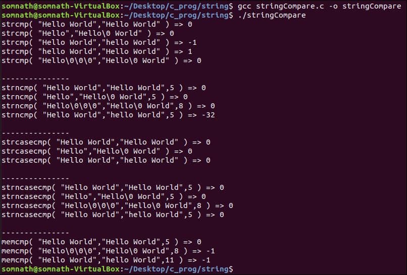 | memcmp( “Hello\0\0\0″,”Hello\0 World”,8 ) | Negative integer | The first 6 characters are the same, but the 7th character is different. Here comparison not stopped like strncmp() when getting ‘\0’ character. |