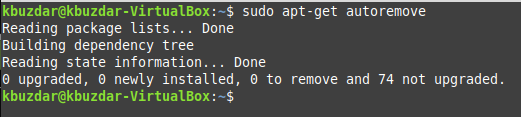 Finally, the last step is to clean up all the irrelevant and unused packages and dependencies from your Linux Mint 20 system that got installed along with the specified package. After the removal of the package, you will not need those packages and dependencies anymore. To get rid of them, you can execute the command shown below: