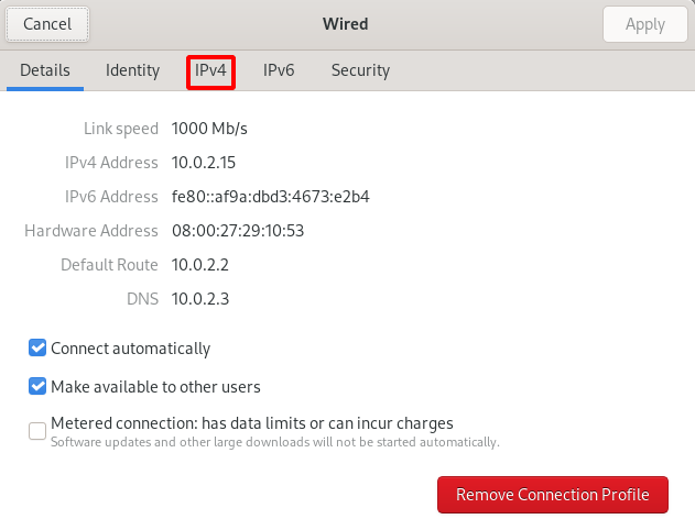 Method 2. Using a graphical method for setting a static IP address on Fedora 33