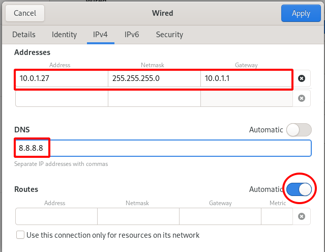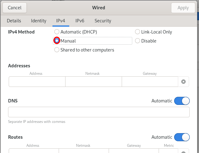Step 6. When you select the manual method, it will open some text boxes for filling the IP addresses, DNS, Routes, and other information related to network configuration, as shown in the above image. We are adding the following details:
