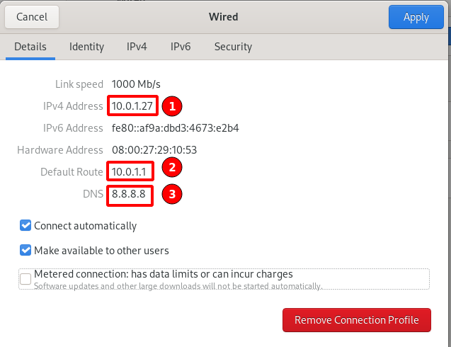 Step 9. I noticed that IP address, Gateway, and DNS are all changed to the new values that we have selected in the above steps:
