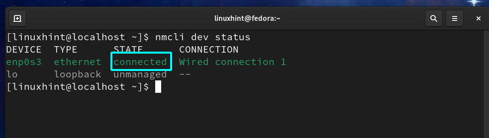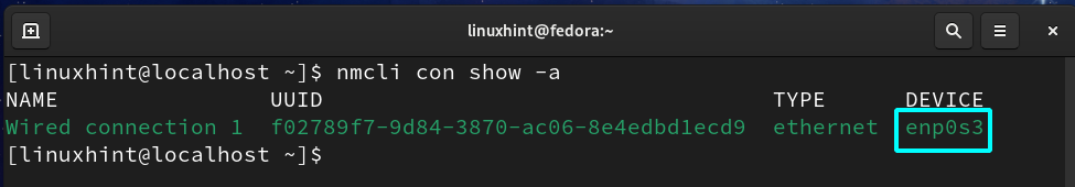 As you can see, right now, only one connection is active on device enp0s3. To see the current network configuration for enp0s3, use the command: