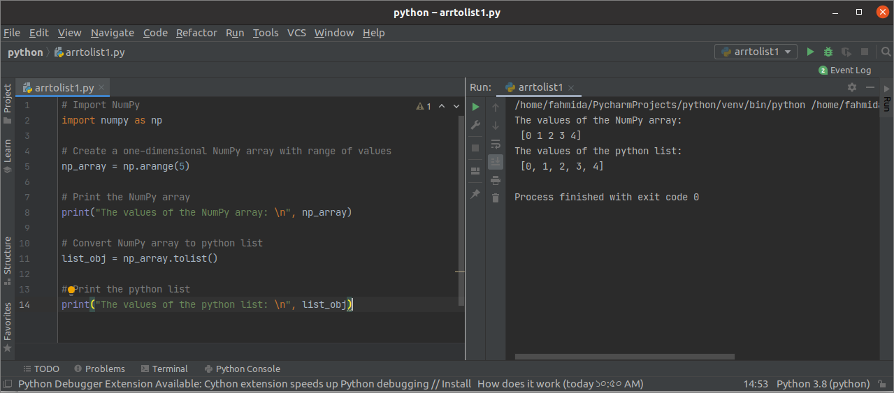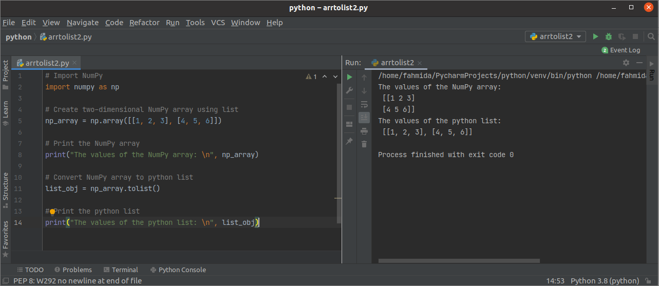 The ways of converting one or more dimensional NumPy array have shown in this tutorial by using multiple examples. You can use any python supported editor to practice the following examples. The popular python editor, PyCharm, is used in this tutorial to write the tutorial script.