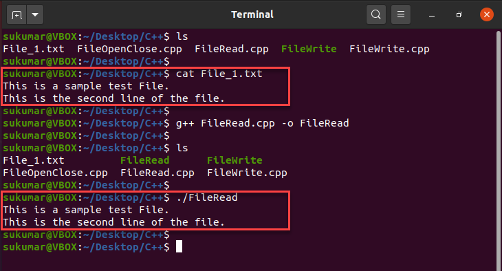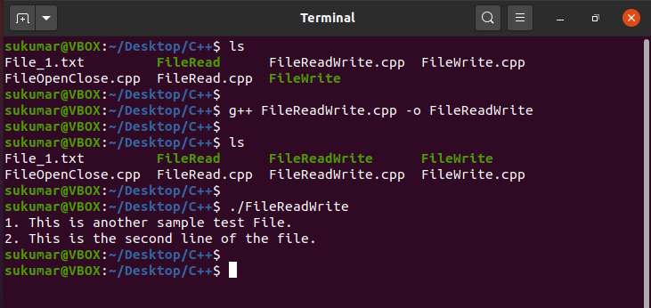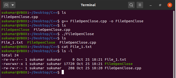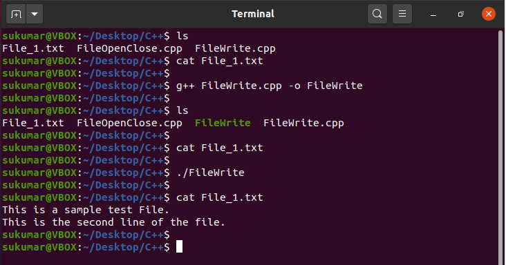 Now, we will compile the above program and execute it. As you can see below, we have successfully written to the file File_1.txt.