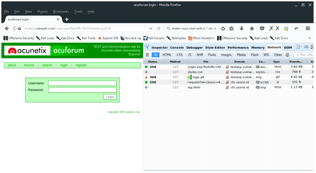 In your firefox browser press keys ‘CTRL + SHIFT + Q‘. Then open the web login page http://testasp.vulnweb.com/Login.asp?RetURL=%2FDefault%2Easp%3F, you will notice some text appear on the network developer tab. It tells you what files are transfered to us. See the method all are GET, since we have not POST any data yet.
